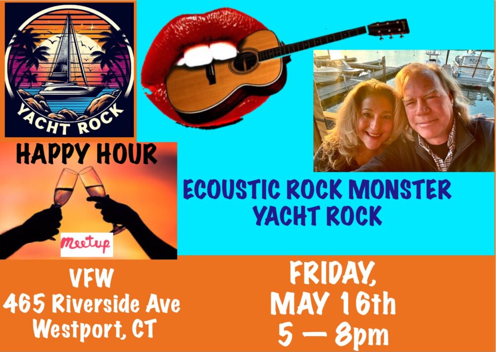 VFW Post 399 invites our community to another unforgettable evening of music and camaraderie at a special Happy Hour Meetup on the Saugatuck River. This event, featuring “Ecoustic Rock Monster” and the smooth sounds of Yacht Rock is on Friday, May 16th from 5 to 8 PM at 465 Riverside Avenue in Westport.