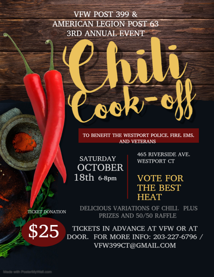 We are proud to announce the Annual Chili Cook-Off Fundraiser, set to take place on Saturday, October 18th from 6PM to 8:00 PM at 465 Riverside Avenue, Westport, CT. The participation fee is $25 and all funds go to Veterans and our Westport’s First Responders. Advance tickets are available at VFW or at door!