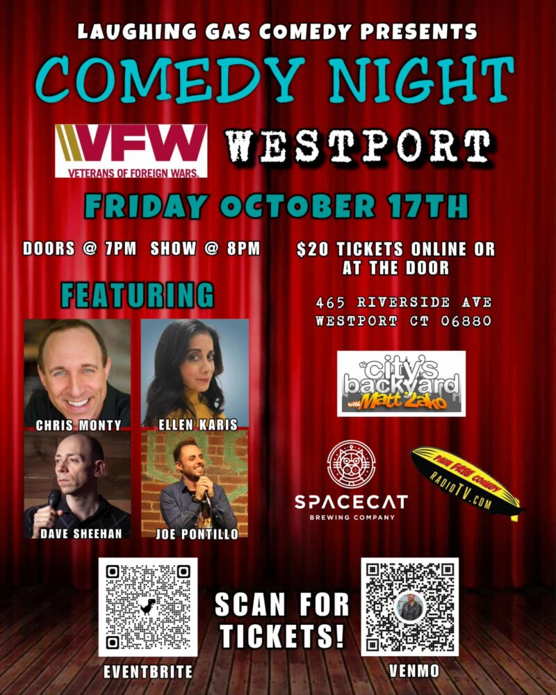 Another insane night of affordable local laughs at the VFW Westport. Pain free comedy when you need it the most! Laughing Gas Comedy and The City’s Backyard present Comedy Night @ the VFW Westport again! October 17th will be a show not to be missed. For this event we’ve got Chris Monty headlining with Ellen Karis, Joe Pontillo and Dave Sheehan.