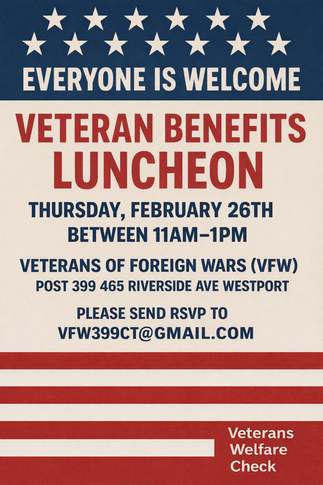 Veterans of Foreign Wars (VFW) Post 399 invites all veterans to a free Veteran Benefits Luncheon on Thursday, February 26th from 11:00 AM to 1:00 PM at 465 Riverside Avenue, Westport. This event is open to all veterans as part of an outreach effort to check in on veterans’ welfare and connect them with the benefits and support they have earned.
