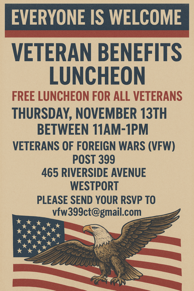 Veterans of Foreign Wars (VFW) Post 399 invites all veterans to a Veteran Benefits Luncheon on Thursday, November 13th from 11:00 AM to 1:00 PM at 465 Riverside Avenue, Westport. This free event is open to all veterans as part of an outreach effort to check in on veterans’ welfare and connect them with the benefits and support they have earned.